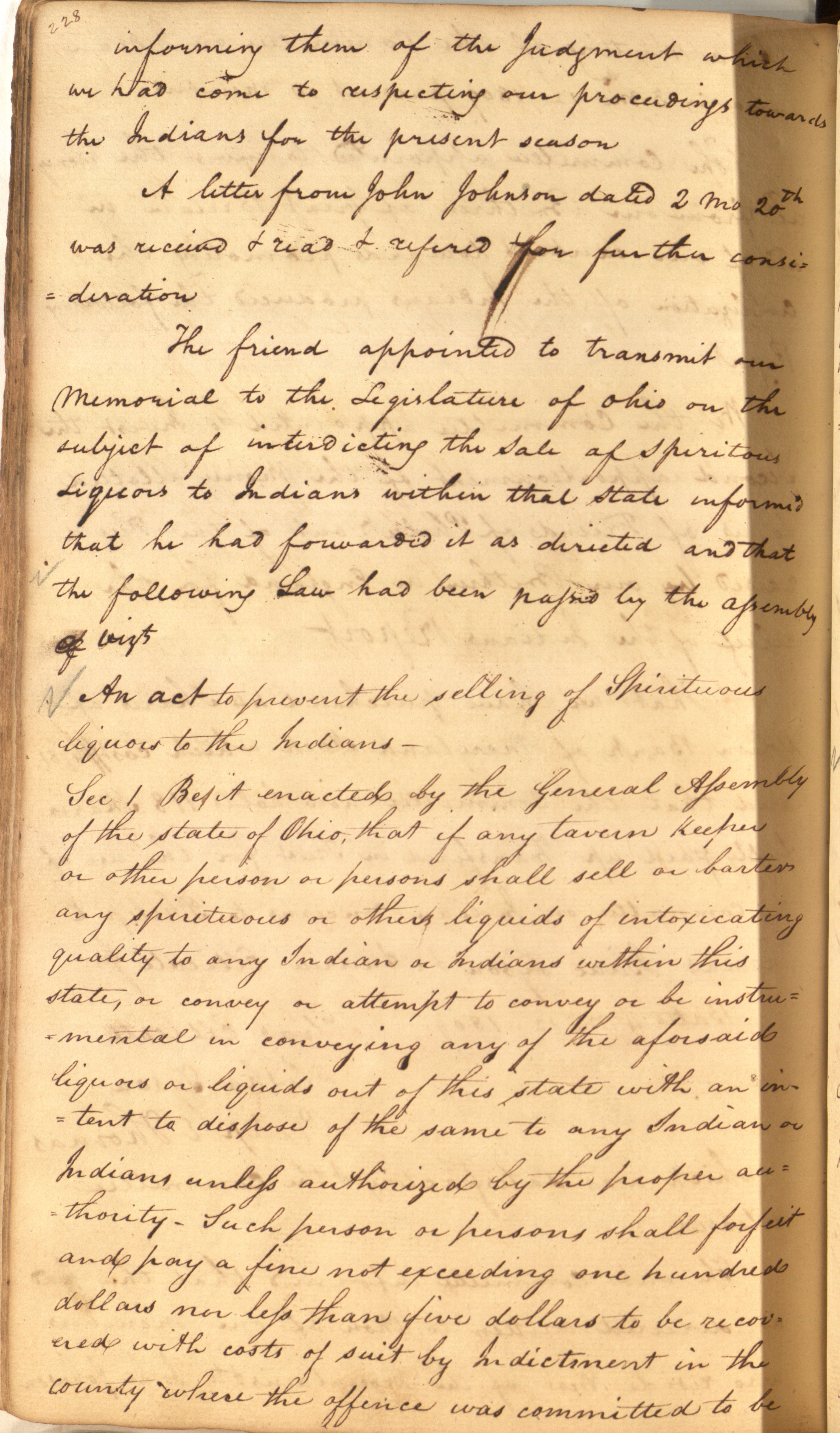 viz An act to prevent the selling of Spirituous