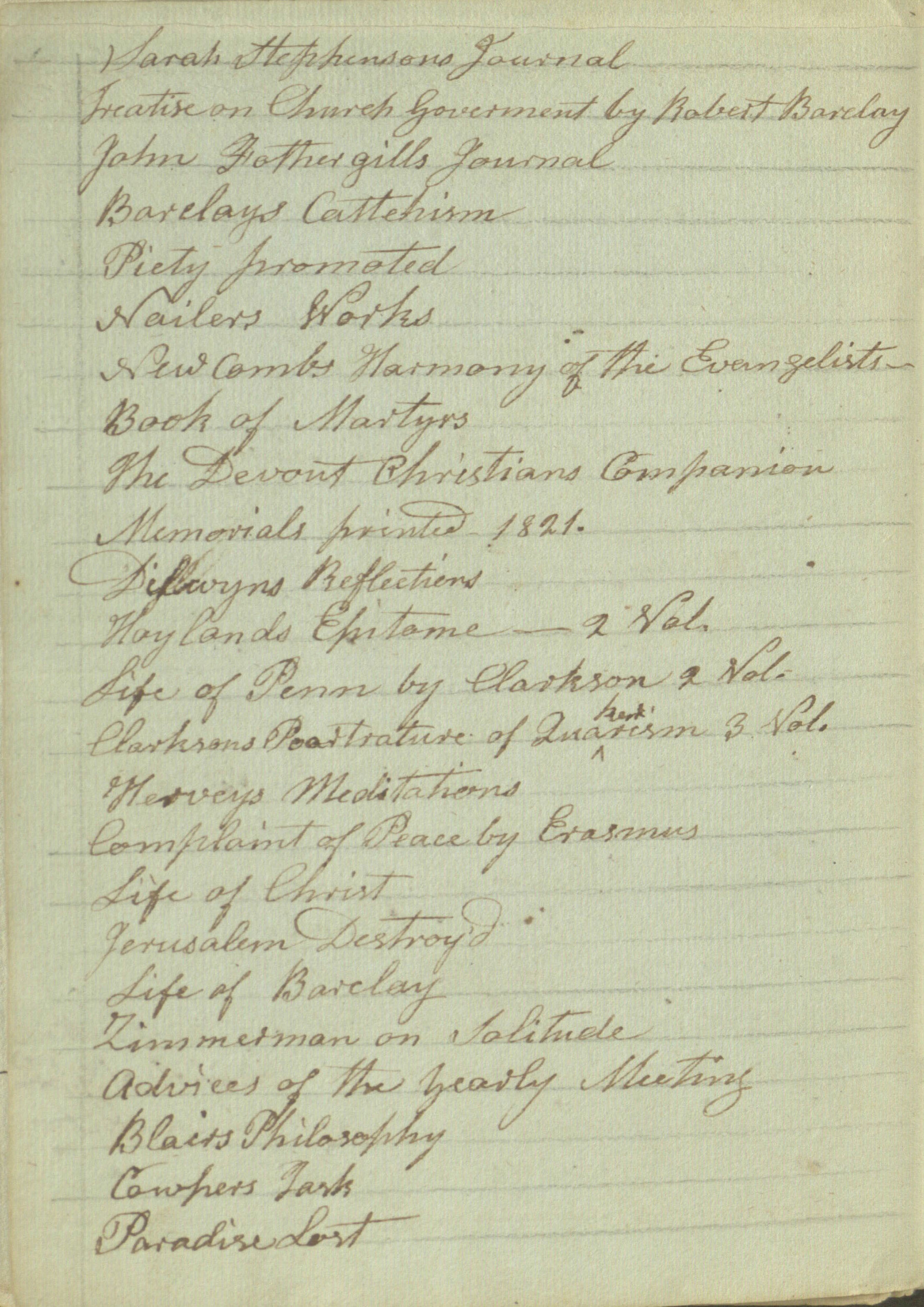Sarah Stephensons Journal Treatise on Church Government by Robert Barclay John Fothergills Journal Barclays Cattchism Piety promoted Nailers Works Newcombs Harmony of the Evangelists Book of Martyrs The Devout Christians Companion Memorials printed 1821. Dillwyns Reflections Haylands Epitome- 2 Vol. Life of Penn by Clarkson 2 Vol. Clarkson’s Portraiture of Quakerrism 3 Vol. Hervey’s meditations Complaint of Peace by Erasmus Life of Christ Jerusalem Destroy'd Life of Barclay Zimmerman on Solitude Advices of the Yearly Meeting Blairs Philosophy Cowpers Lark Paradise Lost