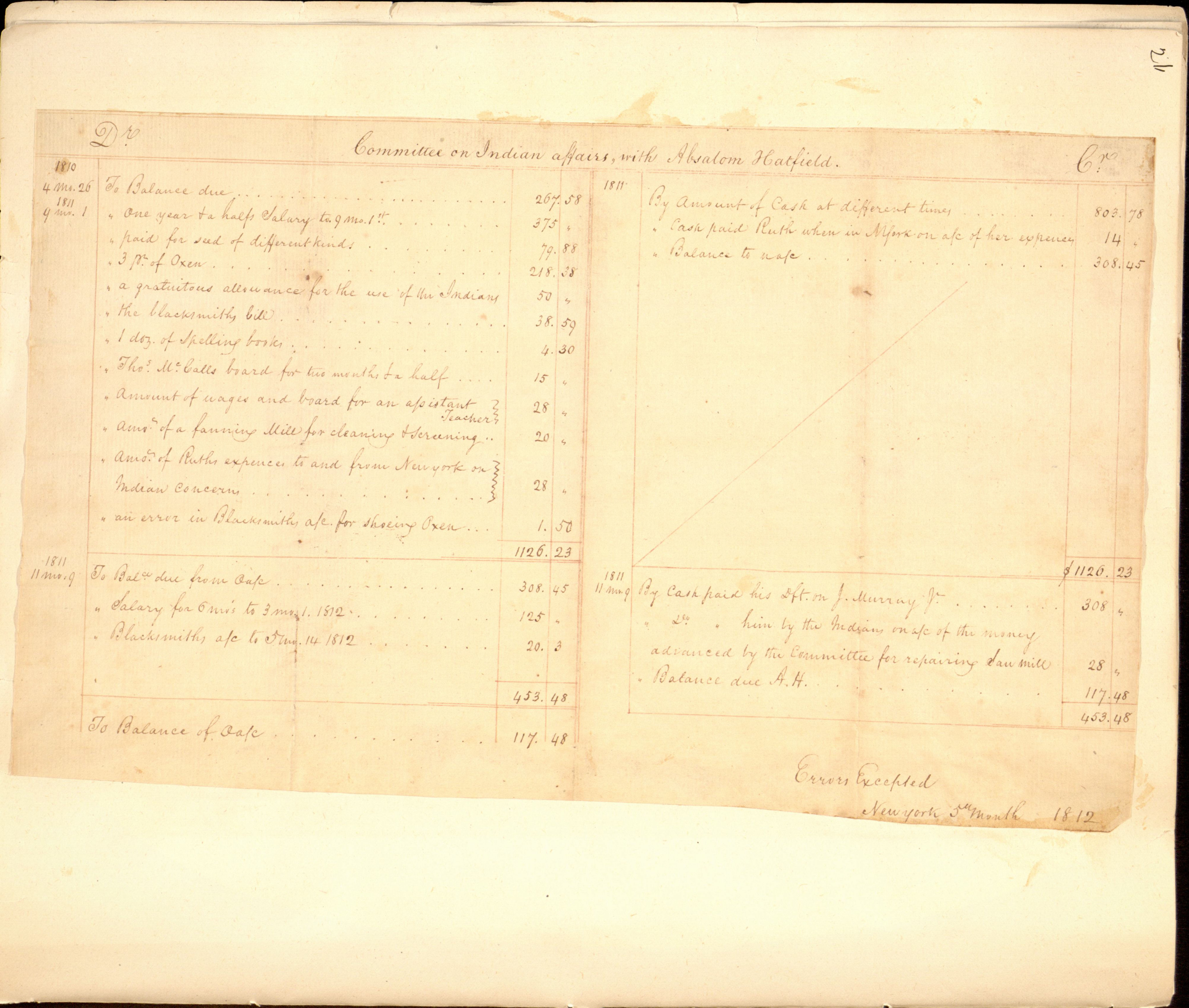 4 Mo. 1 To One year & a half Salary to. 9 Mo.1st 375-- To paid for seed of different kinds 79.88 To 3 pr. of Oxen 218.38 To a gratuitous allowance for the use of the Indians 50-- To the blacksmiths bill 38.59 To 1 doz. of spelling books 4.30 To Tho. McCalls